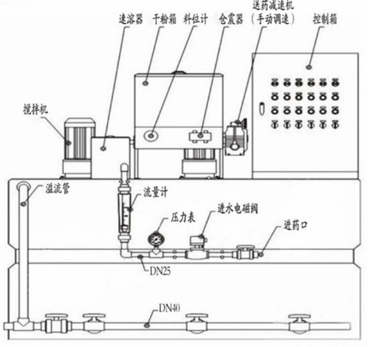 本裝置是粉狀高分子凝絮劑的全自動連續配置及投加系統。干粉絮凝劑從螺旋推進器內進入預混器與清 水進行預混,被濕潤的物料進入配制權進行稀釋,按要求濃度進行配制。
