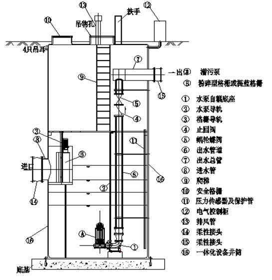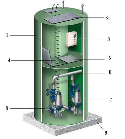 1主體;2泵站頂蓋;3控制系統(可安裝在頂蓋上部);4扶梯;5維護平臺;6出水母管;7潛水泵組;8進水管;9預制水泥底板