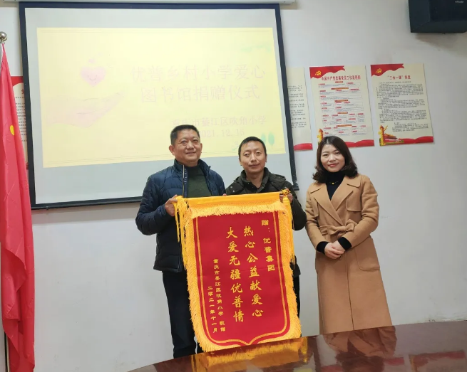 2021年12月15日,優(yōu)普援建的第十一所鄉(xiāng)村小學(xué)愛心圖書館,在重慶綦江區(qū)打通鎮(zhèn)吹角小學(xué)落成。經(jīng)董事長(zhǎng)詹偉先生授權(quán),副總裁陸剛先生率人力資源總監(jiān)余海英女士、《優(yōu)普視界》編輯羅湘峰先生、人事主管李婷女士等趕赴現(xiàn)場(chǎng),與校方負(fù)責(zé)人一同出席了掛牌儀式。