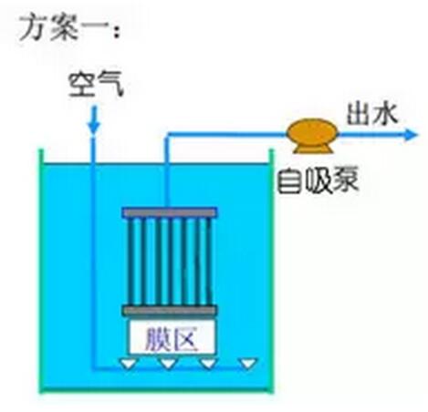 注:如MBR系統內設置平板膜組件,則工藝路線上細格柵部分可取消。 1.3 針對工藝廢水以去除氨氮為主推薦典型工藝 2膜生物反應器系統生物系統設計參數 2.1 缺氧池容積 •設計原則:氮容積負荷0.2kg-N/(m3.d)以下 •流入缺氧池的含氮量:Q1*C(氨氮) •容積:Q1*C(氨氮)/0.2 以上 2.2 硝化池容積 •設計原則:氮容積負荷0.25kg-N/(m3.d)以下 •流入缺氧池的含氮量:Q1*C(氨氮) •容積:Q1*C(氨氮)/0.25 以上 注:硝化池容積考慮膜組件設置后的容積。 3膜生物反應器膜系統設計 3.1 MBR產水系統設計方案 3.2 中空纖維膜輔助系統設計 3.2.1MBR反洗氣洗系統