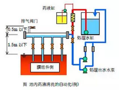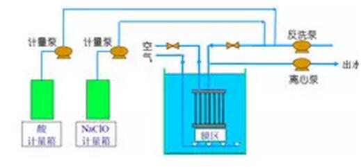 有機物污染通過堿洗效果明顯、鹽結垢通過酸洗效果明顯的原理,將化學加強反洗程序引入到MBR膜的運行過程中。通過類似于低強度的化學清洗的操作,將MBR膜的污染消除在剛形成的階段,阻止膜污染得不到及時恢復形成協同惡化的效應。